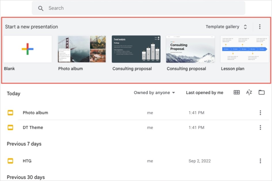 Step 1: On the homepage of the main Google Slides page, you will see several templates at the top. Select Template gallery to see them all. If you see a particular template you want to use, select it. Alternatively, select Blank to create a slideshow from the scratch.