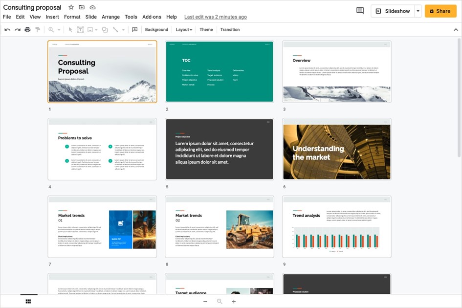 - Go to View > Grid view to see a full screen of the slide thumbnails. This gives you a bigger picture of how your slides are set up and the actions you can perform by right-clicking. To switch this view off, go to View > Grid view and deselect it.