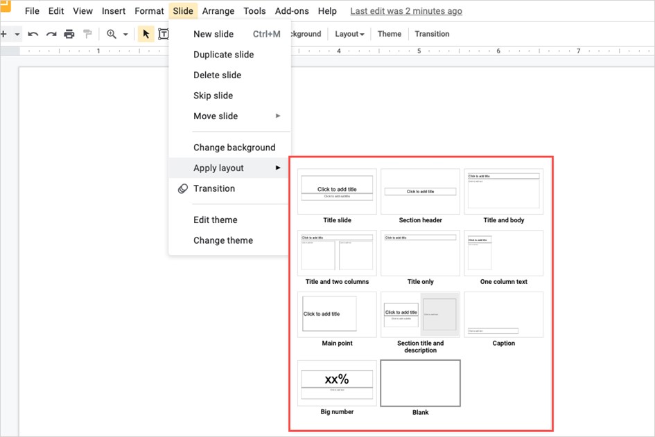 Go to the Slide tab, move to Apply layout, and choose a layout in the pop-out menu.