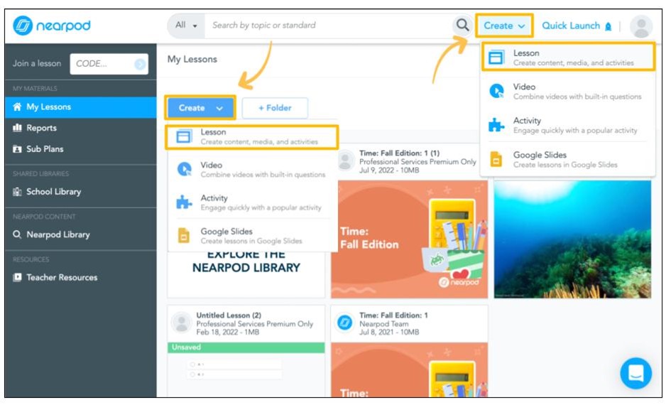 Step 2 - From your Nearpod home Page also known as My Library page, click "Create", then select "Lesson".
