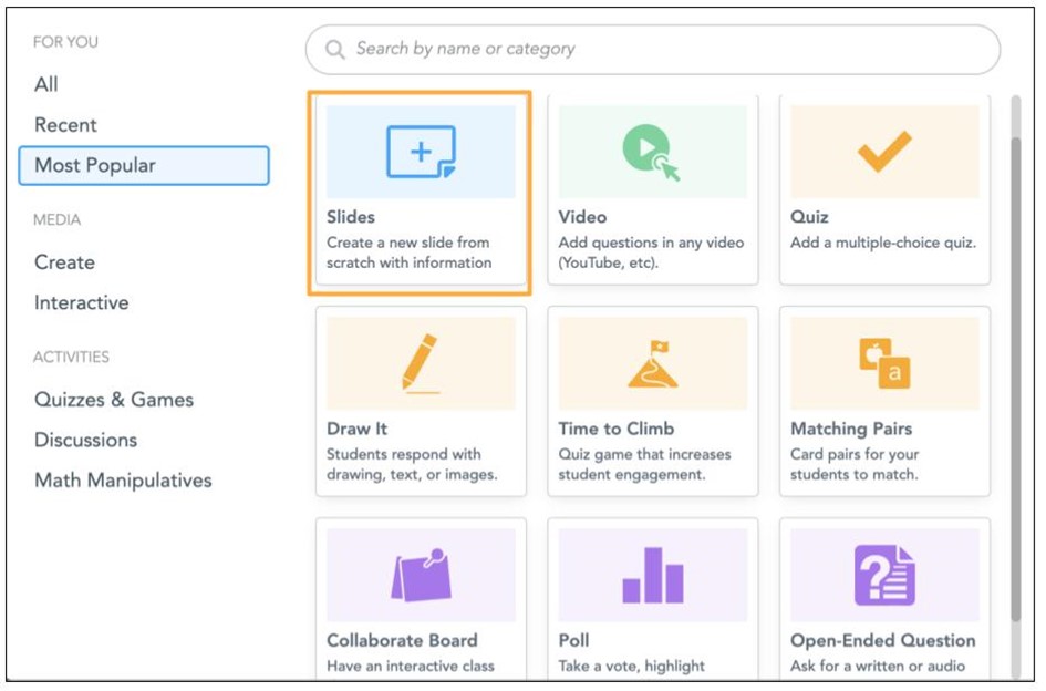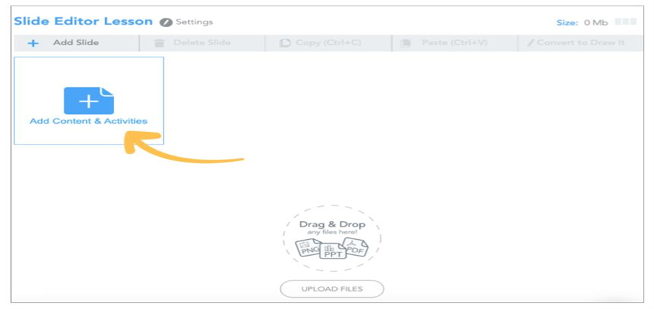 Step 3 - Open the Add Content & Activities option to begin creating your interactive content Slides inside the Nearpod platform. Choose the Slides option to start your first slide.