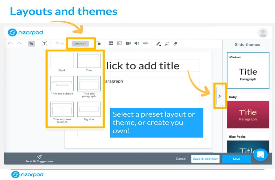 Step 4 - Explore all the creative options available for creating interactive slides in Nearpod. Consider the layouts and themes, use the rich text editing options and add additional media to show your creativity.