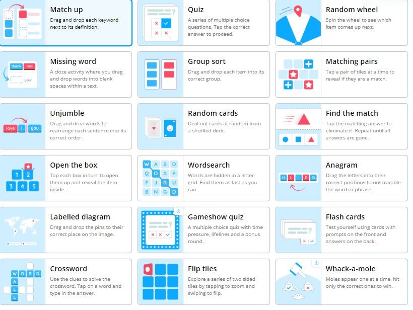 Pick a template. There are various options to choose from and depending on what you plan to teach, you can select one of the following: match-up, quiz, random wheel, missing word, group sort, matching pairs, unjumble, random cards, find the match, open the box, wordsearch, anagram, labeled diagram, gameshow quiz, flashcards, crossword, flip tiles and whack-a-mole among others.